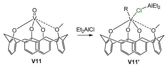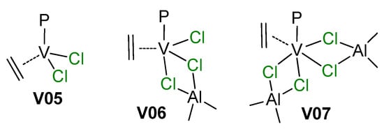- Soshnikov, I.E.; Semikolenova, N.V.; Bryliakov, K.P.; Zakharov, V.A.; Talsi, E.P. Vanadium olefin polymerization catalysts: NMR spectroscopic characterization of V(III) intermediates. J. Organomet. Chem. 2018, 867, 4–13. [Google Scholar] [CrossRef]
