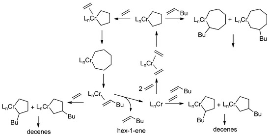- Zilbershtein, T.M.; Kardash, V.A.; Suvorova, V.V.; Golovko, A.K. Decene formation in ethylene trimerization reaction catalyzed by Cr-pyrrole system. Appl. Catal. A Gen. 2014, 475, 371–378. [Google Scholar] [CrossRef]