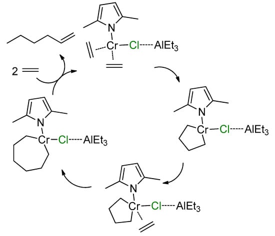 - Do, L.H.; Labinger, J.A.; Bercaw, J.E. Mechanistic Studies of Ethylene and α-Olefin Co-Oligomerization Catalyzed by Chromium–PNP Complexes. Organometallics 2012, 31, 5143–5149. [Google Scholar] [CrossRef][Green Version]
