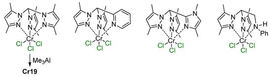 - Zhang, J.; Li, A.; Andy Hor, T.S. Crystallographic Revelation of the Role of AlMe3 (in MAO) in Cr [NNN] Pyrazolyl Catalyzed Ethylene Trimerization. Organometallics 2009, 28, 2935–2937. [Google Scholar] [CrossRef]