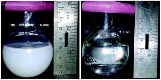 A digital image of a quartz reactor with a capacity of 70 mL (56 mm in diameter at the center) filled with 40 mL of solution and 25 mg of titania-based catalyst powder while it was spinning (left), and in static circumstances, using thin films produced with 1 mg of the same photocatalyst (right). Replicated from ref. [56].
