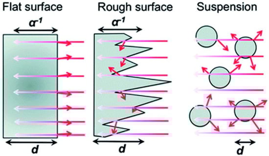 Dispersion of light in nanostructured and flat films as well as in suspensions of particles. A α−1 is the optical penetration depth, and d is the film or particle thickness. Short arrows denote light that has been reflected or dispersed. Replicated from ref. [13].