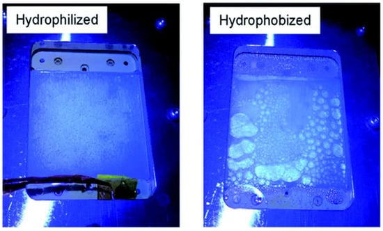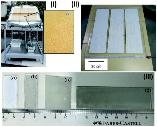 By using a similar approach to Schroder et al., Goto et al. developed a 1 × 1 m2 size SrTiO3-Al panel (Figure 3II) for large-scale hydrogen production [36]. The study focused on a number of factors to enhance the performance of panel-type catalysts for water splitting reactions, including tilting angle (10–20°) and water layer thickness (1–5 and 5 mm). These factors are crucial to reduce liquid weight and, consequently, pressure, in order to achieve the smooth release of gas bubbles. Without induced convection, a layer of 1 mm thick water might release hydrogen bubbles.