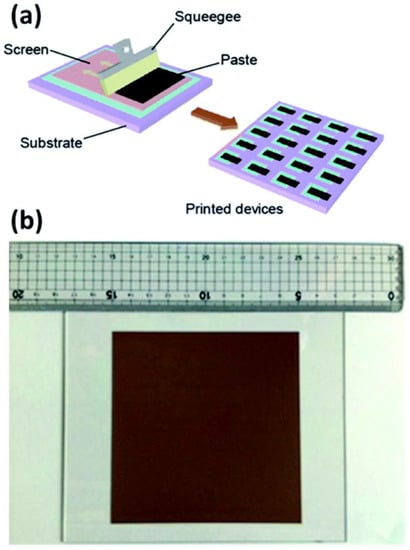 (a) Schematic for screen printing method, and (b) photo image of a 10 × 10 cm2 screen printed device. Replicated from ref. [82,29].