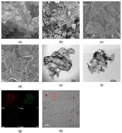 Among semiconductor materials, MoO2 has excellent electrical conductivity and photoelectrochemical activity due to its unique metallic properties which are attributed to the fermi level of MoO2 provided by its 4d orbital [,]. Therefore, MoO2 has been widely investigated and applied in photocatalysis, electrocatalysis, batteries, and other fields [,,]. Recently, researchers have reported some work on g-C3N4/MoO2 composites for photocatalysis. In the literature, Li et al. realized an obvious improvement in photocatalytic efficiency in the reduction of CO2 over the g-C3N4/MoO2 composite, which can be attributed to the construction of a Schottky junction between g-C3N4 and MoO2 in the composite []. Yadav et al. prepared a microspherical MoO2/g-C3N4 core-shell composite for the high-efficiency photocatalytic degradation of xylenol orange by a simple one-step calcination procedure []. In addition, Ji et al. prepared a g-C3N4/MoO2 2D-2D structured composite by a cumbersome three-step process for enhanced photocatalytic degradation of Rhodamine B []. However, there are very few studies on the photocatalytic hydrogen evolution of g-C3N4/MoO2 composites []. Consequently, it is necessary to further explore the possibility of g-C3N4/MoO2 composites in photocatalytic hydrogen evolution.