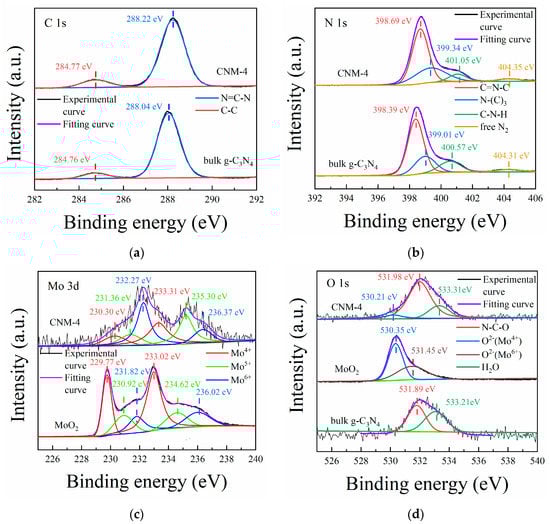 XPS spectra of the optimal composite CNM-4 in comparison with those of the control samples (bulk g-C3N4 and commercial MoO2): (a) C 1s, (b) N 1s, (c) Mo 3d, and (d) O 1s.
