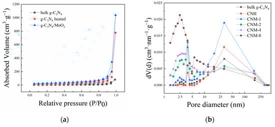To further explore the internal pore structure in the composite samples, a set of N2 adsorption-desorption tests were conducted on bulk g-C3N4, CNH, and this series of CNM composite samples. The recorded N2 adsorption-desorption isotherms are shown in Figure 4a. Based on them, the specific surface area (SBET), pore diameter, and pore volume of the samples were calculated. The results are listed in Table 2, in which the pore diameter distribution is also displayed in Figure 4b. Firstly, comparing the SBET values of the samples (see Table 2) with that of the bulk g-C3N4 (12.34 m2·g−1), the sample CNH shows a larger SBET value of 55.65 m2·g−1, which can be attributed to the oxidation of g-C3N4 by O2 from air []. The SBET values of CNM-1, CNM-2, CNM-4, and CNM-8 samples were 102.91, 89.67, 96.17, and 116.32 m2·g−1, respectively, which were much larger than those of CN and CNH samples. Based on the above facts, the increase in specific surface area can be attributed to the spalling effect of ammonia produced by the decomposition of ammonium molybdate in the g-C3N4 layers and O2 corrosion of g-C3N4 []. Then, the pore size distribution of the samples was examined (see Figure 4b). Compared with that of the bulk g-C3N4, the CNH sample has more pores with a large pore size of about 10~50 nm but fewer pores with a small pore size of roughly 3.833 nm, indicating that partial small pores are expanded into large mesopores under the erosion of O2. The change of small pores into large pores will lead to an increase in specific surface area and pore volume. Moreover, the pore diameter of the sample CNM-1 increases in both ranges, which can be explained by the fact that the escape of NH3 produces a large number of micro/mesopores and oxygen corrosion simultaneously. Furthermore, with an increasing concentration of ammonium molybdate in the precursor solution, the pore diameter distribution changed significantly. After examining the pore diameter of CNM-2, CNM-4, and CNM-8, it can be seen that more small-pore-size mesopores and fewer large-pore-size micropores are built in the samples. This phenomenon may be attributed to two factors. On the one hand, because the escape of more ammonia reduced the local oxygen concentration in the sample, the oxidation of g-C3N4 was limited, thereby restraining the further expansion of pores. On the other hand, after more MoO2 was deposed into the large pore, part of the large pore was blocked into small ones. As a result, there are more small pores and fewer large pores after adding more (NH4)2MoO4·4H2O.