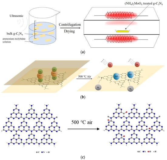 Schematic diagrams of (a) the synthesis strategy for the samples, (b) the formation mechanism for the exfoliated g-C3N4/MoO2 composite, and (c) the oxidation mechanism for g-C3N4.