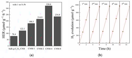 The photocatalytic performance was evaluated by measuring the photocatalytic hydrogen evolution ability over the samples under visible light, and the results are displayed in Figure 6. Figure 6a clearly shows that the HER of the samples CNH and CNM-1 to CNM-8 increases with increasing ammonium molybdate concentration in the pre-cursor solution, reaching a maximum value of 320.8 μmol·g−1·h−1 when the ammonium molybdate concentration is 4 mmol·L−1. However, under the same conditions, the photocatalytic HER of a bulk g-C3N4 sample is only 78.4 μmol·g−1·h−1. In other words, the performance of the optimal sample CNM-4 in this work is 4.1 times that of bulk g-C3N4. Therefore, it can be confirmed that the improved performance of the composite samples is due to the increasing amount of MoO2 in the samples and their enhanced specific surface area. Compared with CNM-4, the photocatalytic HER of the sample CNM-8 would be significantly reduced because the band gap of C3N4 in CNM-8 reaches 3.02 eV, which can only absorb light with a wavelength below 410 nm. However, because a 400 nm filter was used to cut off the UV light source below 400 nm in this work, the shortage of the available light for the sample CNM-8 would certainly result in the decline of its hydrogen evolution performance. Consequently, although a higher concentration of ammonium molybdate can be beneficial for both enhancing the amount of MoO2 and producing more pores in the sample CNM-8, the intensified oxidation of bulk g-C3N4 will widen the band gap of g-C3N4, making it impossible to make effective use of visible light. In addition, compared with bulk g-C3N4, although the sample CNH will lose partial absorption capacity of visible light sources due to the oxidation of g-C3N4, its photocatalytic hydrogen evolution performance was still improved significantly. This result can be attributed to the exposure of more active sites caused by the expansion of a specific surface area. The as-prepared composite samples thermally treated with ammonium molybdate show more excellent photocatalytic hydrogen evolution performance because of their larger specific surface area and more abundant mesopores in the samples. Based on the above results, it can be concluded that the improvement of photocatalytic hydrogen evolution performance of the present g-C3N4/MoO2 composite samples is caused by a synergistic effect of the MoO2 recombination with g-C3N4 and the increase in specific surface area. However, it has to be noted that excessive oxidation will reduce the light absorption range of g-C3N4, which will ultimately finally lead to a decline in the photocatalytic hydrogen evolution performance of the samples.