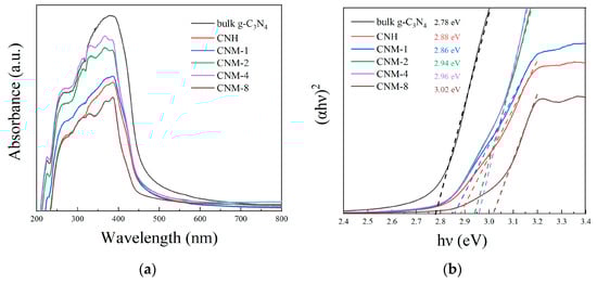 In order to characterize the absorption ability of the prepared materials for light, the UV-Vis absorption spectra of bulk g-C3N4, CNH, and all the g-C3N4/MoO2 composite samples were measured. Figure 7a shows the recorded spectra of these samples. As shown in the figure, when compared to bulk g-C3N4, after thermal treatment, the resultant samples CNH and CNM would have a lower light absorption capacity due to their widened band gap. Moreover, Figure 7b displays their corresponding (ahν)2 versus Eg plots, from which the band gap of the corresponding materials can be obtained. As can be seen, the band gap of the sample bulk g-C3N4, CNH, and CNM-1–CNM-8 is 2.78, 2.88, 2.86, 2.94, 2.96, and 3.02 eV, respectively, which can be attributed to the changed structure caused by the increased degree of oxidation on g-C3N4. The band gap of g-C3N4 is excited by π-π * excitation, in which the conjugated C 2p and N 2p orbitals in the heptazine form the conduction band, while the 2p orbitals of the edge N atoms form the valence band []. However, the oxidation of g-C3N4 will break the C=N bond conjugated structure into an N-C-O bond, resulting in an expanded band gap of g-C3N4 in the sample. Although the band gap of the samples CNM-1–CNM-4 continues to increase, their light absorption capacity becomes stronger and stronger, which can be attributed to the increased loading amount of MoO2 in the sample. On the other hand, the sample CNM-8 shows a poor light absorption capacity due to the greatly widened band gap of g-C3N4 caused by excessive oxidation.
