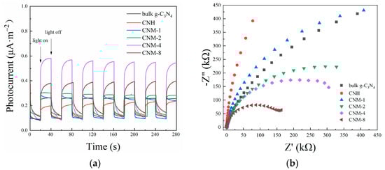 To explain the photocatalytic activity for hydrogen evolution of the prepared samples, their photoelectric response ability and carrier transport ability were investigated by transient photocurrent response and electrochemical impedance tests. Figure 8a shows the transient photocurrent response curves of all the samples. From this figure, it can be clearly seen that the optimal sample CNM-4, which presents the highest efficiency for photocatalytic hydrogen evolution, also has the strongest photocurrent response ability. It is easy to understand that its photocurrent intensity is stronger than those of the samples CNM-1 and CNM-2 because it contains more MoO2. Because the loaded MoO2 can effectively separate photogenerated electrons and holes, more free electrons will be converted into current without becoming internal energy after the compositing of MoO2 with g-C3N4. However, the photocurrent intensity of CNM-8 with the highest content of MoO2 is attenuated, which is obviously due to the poor light utilization ability of CNM-8, because it can only make use of the light in the band range between 400–410 nm after the light with a wavelength shorter than 400 nm is filtered. In addition, it is seen that the photocurrent intensity of bulk g-C3N4 is stronger than that of the sample CNH, because the widening of the band gap after the oxidation of g-C3N4 will result in a poor utilization efficiency of light.