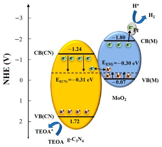 Based on the results mentioned above and the support of relevant theories, the photocatalytic hydrogen evolution mechanism over the obtained photocatalysts was proposed in Figure 9. In order to obtain the energy band correlation between g-C3N4 and MoO2 in the figure, with the optimal sample CNM-4 as an example, Mott-Schottky plots, VB-XPS spectra, and UV-Vis absorption spectra were carried out, and the results are displayed in Figure S4. In this study, the flat band potentials of CNM-4 and MoO2 can be obtained from the recorded Mott-Schottky plots, which are −0.53 and −0.52 eV, respectively. After eliminating the influence of the potential from the Ag/AgCl reference electrode, their final flat band potential values are −0.31 and −0.30 eV, respectively []. From the VB-XPS spectra, the potential differences in the energy bands of CNM-4 and MoO2 from the valence band top to the Fermi level are 2.02 and 0.23 eV, respectively []. In general, the flat band potential value is approximately equal to the Fermi level [,]. Based on the above data, it can be calculated that the valence band values of CNM-4 and MoO2 are 1.72 and −0.07 eV, respectively. In addition, the band gap of CNM-4 and MoO2 could be obtained from Figure 7b and Figure S4, and the calculated values of their valence bands are −1.24 and −1.80 eV, respectively. Finally, according to the energy band data obtained from the test, the photocatalytic hydrogen evolution mechanism was proposed.