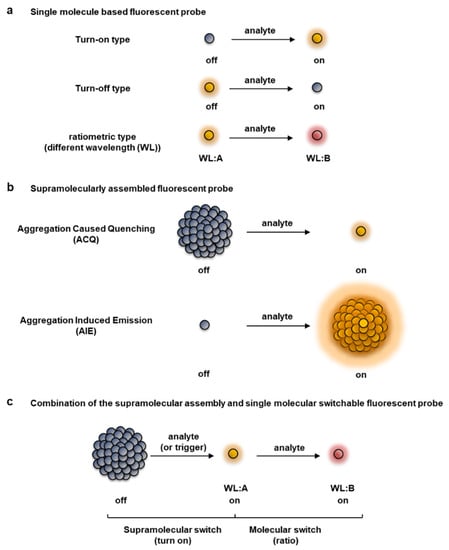 Classification of fluorescent probes based on patterns of the fluorescent response. (a) Single molecule type fluorescent probes, including turn-on, turn-off, and ratiometric detection types. (b) Supramolecular-type fluorescent probe (turn-on type), which can be roughly classified into aggregation-caused quenching (ACQ) and aggregation-induced emission (AIE) types. (c) Combination of a supramolecular assembly-triggered and single molecule switchable fluorescent probe, which is a novel category proposed by us [26,27,28,29,30,31].