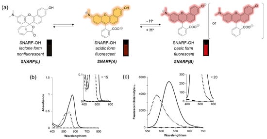 (a) Equilibria of SNARF with fluorescent images. (b) Absorption and (c) emission spectra at different pH values and with different solvents. Solid line: basic form (pH 9.0), dotted line: acidic form (pH 5.0), dashed line: lactone form (in acetonitrile) [SNARF-OH] = 10 μM in 10 mM Tris, Hepes, and acetate buffer (pH 5.0 or 9.0) or acetonitrile [28].