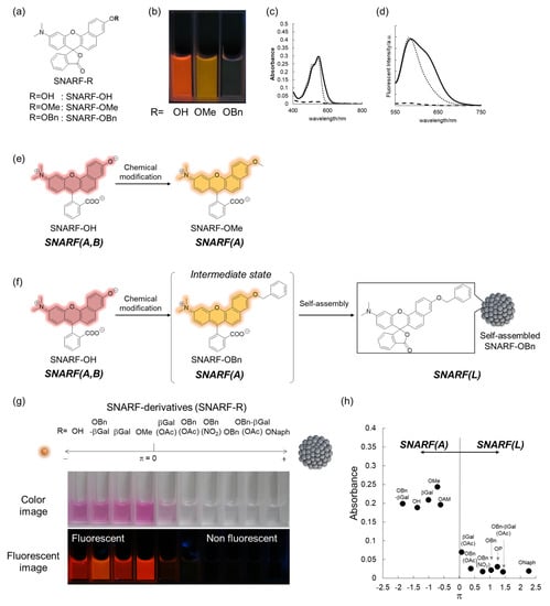 (a–d) Structure (a), photograph at pH 7.0 (b), absorption spectra (c), and emission spectra (d) (excitation at 534 nm) of SNARF-OH (solid lines), SNARF-OMe (dotted lines), and SNARF-OBn (dashed lines). Schematic illustration of (e) SNARF-OMe to form SNARF(A) and (f) SNARF-OBn to form SNARF(L) in aqueous media. (g) Comparison of the absorption and fluorescence of SNARF derivatives divided by the Hansch–Fujita hydrophobic parameter (π) of the inserted substituent of SNARF. (h) Relationships between the π value of the inserted substituent and the absorbance measured in aqueous media. See [28] for further details.