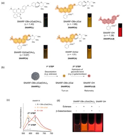 As described in Section 2.1, the equilibria between the assembled and dispersed state of the phenolic substituent-protected SNARF could be classified by the π value of R; according to our previous research, at π < 0, SNARF(A) is formed and, at π > 0, SNARF(L) is formed [28]. Based on this theory, a two-step activatable fluorescent probe could be rationally designed [28]. As an example, the π value of SNARF-OBn-βGal(OAc)4 is 1.43 and that of deacetylated SNARF-OBn-βGal is −1.85; therefore, SNARF-OBn-βGal(OAc)4 in SNARF(L) form and SNARF-OBn-βGal in SNARF(A) form were designed, as shown in Figure 5 [27]. SNARF-OBn-βGal(OAc)4 showed very weak fluorescence and SNARF-OBn-βGal showed strong fluorescence identified with SNARF(A) (Figure 5a). Therefore, the deacetylation reaction of SNARF-OBn-βGal(OAc)4 produced SNARF-OBn-βGal, indicating that the turn-on fluorescence change occurred. Subsequently, SNARF-OH was produced from SNARF-OBn-βGal through hydrolysis of the glycoside bond, allowing for the ratiometric change in fluorescence to be observed (Figure 5b,c). As shown in Figure 5d, although SNARF-OBn-βGal(OAc)4 showed weak fluorescence, strong fluorescence appeared in the presence of esterase and a fluorescence color change was observed in the presence of both esterase and β-galactosidase. The fluorescent color of the resultant product was the same with SNARF-OH. Notably, SNARF-OβGal(OAc)4, which also has esterase and galactosidase-activatable properties, existed in SNARF(A) form in the aqueous condition because a self-assembled cluster could not be formed because of the lower hydrophobicity of the phenolic substituent (π = 0.07). These results strongly indicated that a latent ratiometric fluorescent probe could be designed rationally.