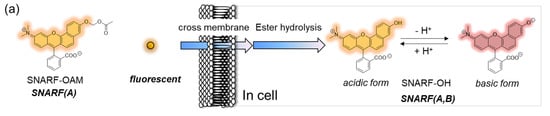 One of the rational strategies to design a ratiometric fluorescent probe (Figure 1a) is to utilize a ratiometric pH probe [32]. The xanthene dye seminapthorhodafluor (SNARF) is well known as a useful ratiometric fluorescent pH probe [33,34,35]. Thus, the concept and design of a SNARF-based ratiometric fluorescent probe is introduced.