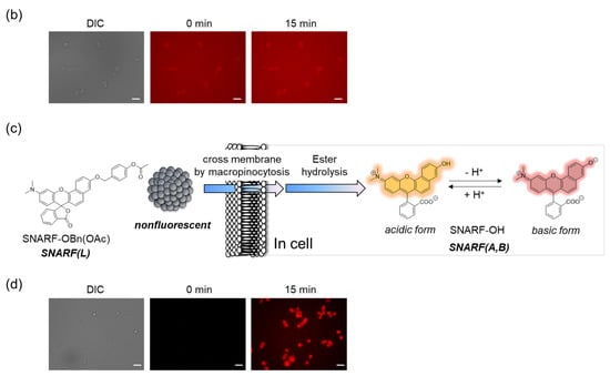 SNARF is mostly used as a ratiometric fluorescent pH probe [25,32]. In this section, we focus on applying SNARF as a ratiometric pH probe to monitor the intracellular pH and overcome the current challenges described above [26,27,28]. SNARF itself has low cell permeability; therefore, the phenolic group of SNARF should be converted to esterase substrates such as acetate (OAc) and acetoxymethyl ester (OAM) to increase the cell permeability (Figure 6a) [32]. However, the intrinsic fluorescence of SNARF-OAM (π = −0.62) causes strong extracellular fluorescence, as shown in Figure 6b, which makes it difficult to distinguish between the inside and outside of the cell without a washing procedure. Thus, a latent ratiometric fluorescent probe that responds to esterase and produces the pH-sensitive fluorescence of SNARF can overcome these difficulties. To achieve this, SNARF-OBn(OAc) (π = 0.90) was designed as a latent ratiometric fluorescent pH probe activated by esterase (Figure 6c) [27]. SNARF-OBn(OAc) displayed negligible absorption and fluorescence emission because of the formation of self-assembled clusters approximately 70 nm in size. Moreover, esterase-treated SNARF-OBn(OAc) showed fluorescence emission characterized as SNARF-OH with the diffusion of the self-assembled clusters [28]. It should be noted that SNARF-OBn(OAc) also formed self-assembled clusters in the cell culture media such as EMEM medium with FBS [27]. Upon addition of SNARF-OBn(OAc), the medium was scarcely fluorescent and only the uptake of the fluorescent intensity inside the cell was observed after long-term incubation (about 15 min incubation) (Figure 6d). The intracellular pH values could be measured not only for adherent cells [27], but also for the loosely adherent or floating cells [28] using SNARF-OBn(OAc) because of the advantage of wash-free procedure. These results established the superiority of SNARF-OBn(OAc) as an intracellular pH probe with notable cell permeability and low background noise. These properties should be advantageous for in vivo applications because of the difficulty in washing out the redundant probe. Moreover, a latent ratiometric fluorescent pH probe can be designed to target different activators by changing the substituent for the phenolic-protecting group of SNARF-OH based on our proposed strategy [28]. SNARF-OBn(pNO2) was designed as a latent fluorescent pH probe activated in hypoxic conditions [26]. The mechanism of cellular uptake of self-assembled SNARF derivatives was investigated using SNARF-Dan (π = 1.81), which could monitor the self-assembled state by colorimetric change in the fluorescence of Dansyl and SNARF fluorophores (Figure 7) [28]. That is, the self-assembled cluster of SNARF-Dan showed strong Dansyl fluorescence without SNARF fluorescence, but disassembled SNARF-Dan has the fluorescence of both Dansyl and SNARF (Figure 7a). When SNARF-Dan was incubated with HeLa cells, endosome-like punctate fluorescence derived from Dansyl fluorophore was observed inside the cells for a long time period (Figure 7b). Following a detailed assessment of the process of cellular uptake of self-assembled SNARF-Dan, it was suggested that the self-assembled cluster of SNARF derivatives was introduced into the cell via macropinocytosis. Though the details of how endosomal escape after macropinocytic uptake of self-assembled SNARF derivatives occurs still remain ambiguous, the utility of self-assembled SNARF derivatives is strongly indicated [28].