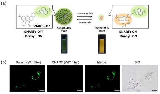 (a) Schematic illustration of colorimetric fluorescent change of SNARF-Dan between assembled and disassembled states. (b) Fluorescent images and bright-field transmission of HeLa cells pre-treated with SNARF-Dan in FBS-containing EMEM medium (scale bar: 10 μm). See [28] for further details.