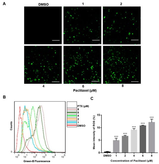 Reactive oxygen species (ROS), produced either from the action of NADPH oxidase (NOX) or from the mitochondrial respiratory chain, were reported to play a crucial role in progress of apoptosis [24]. The confocal images clearly depicted a significant increase in the florescence of DCFH-DA (green) of the treatment with PTX, whereas the high-dose PTX treatment (8 μM) displayed the highest florescence of DCFH-DA (green) (Figure 2A). The DCFH-DA flow cytometry assay showed that ROS levels were augmented with exposure of a higher dose of PTX in PC3M cells (Figure 2B). Thus, the above data demonstrated that, compared to the control group, PC3M cells treated with PTX showed a significant increase of ROS (Figure 2C).