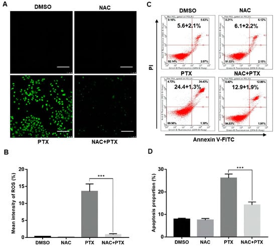 The antioxidant N-acetyl cysteine (NAC), working as ROS scavenger, was applied to further analyze the elevation of ROS. We found that ROS levels activated by PTX in PC3M cells could be markedly suppressed by NAC (5 mM, 12 h) (Figure 3A,B). We then performed annexin V-FITC and PI assay, showing that the apoptotic percentage of PC3M cells with PTX (2 μM) could be markedly suppressed by NAC (5 mM, 24 h) (Figure 3C,D). The evidence showed that ROS had a role in PTX-induced apoptosis.