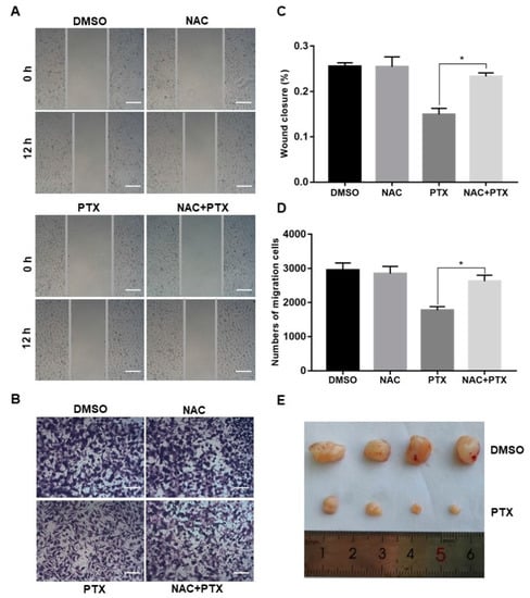 Migration and invasion are complex processes that are involved in the malignant transformation of tumors [25]. The scratch wound assay and invasion assay were conducted to observe the cell migration of PC3M after the treatment with PTX (2 µM). PTX inhibited cell migration compared to control group at 12 h (Figure 5A,C). Similar trends were observed in the transwell invasion assay (Figure 5B,D). The number of invasive cells decreased in the treatment with PTX after 24 h. Aside from this, when compared to treatment with PTX, the number of migrated or invasive cells were slightly increased in the combination treatment with NAC and PTX (Figure 5A–D). Overall, PTX could effectively inhibit migration and invasion of PC3M cells, and ROS may play a catalytic role in inhibiting the migrated ability and invasive ability. Further to this, the PC3M-xenografted mice tumor model was developed to study the impact of the PTX treatment on prostate tumor growth. After 2 weeks of PC3M injection into mice, tumor-bearing mice were distributed into two groups (four mice in each group). One group was the control; the other was given a treatment regimen of subcutaneously injected PTX. Another 2 weeks later, tumor length and breadth were measured using a Vernier caliper. The tumor volumes of those mice treated with PTX were significantly smaller, compared to the control (Figure 5E). In conclusion, PTX effectively suppressed prostate tumor growth in vivo.