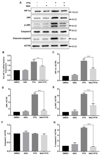 The cellular response to hypoxia was centered on HIF-1α; we then measured the expression levels of HIF-1α. The mRNA and protein levels of HIF-1α were both increased significantly with the increase of ROS levels (Figure 6B,C). In hypoxia, HIF-1α was stabilized and mainly translocated to the nucleus, confirmed by the immunofluorescence assay (Figure S1). Furthermore, to investigate how HIF-1α control the expression of caspase-3, we measured the expression of JNK. Compared with control group, total and phosphorylated JNK protein expression were increased in the treatment with PTX, downregulated by the co-incubation with NAC and PTX (Figure 6D,E). The expression of caspase-3 was unchanged, but that of cleaved-caspase-3 was consistent with that of JNK (Figure 6F,G). We speculated that the activated JNK contributed to the release of cytochrome c from mitochondrial into the cytoplasm, leading to caspase-3 activation, which ultimately causes apoptosis (Figure 6A). Taken together, these results showed that PTX could induce apoptosis by triggering ROS-HIF-1α dependent JNK/caspase-3 cascade.