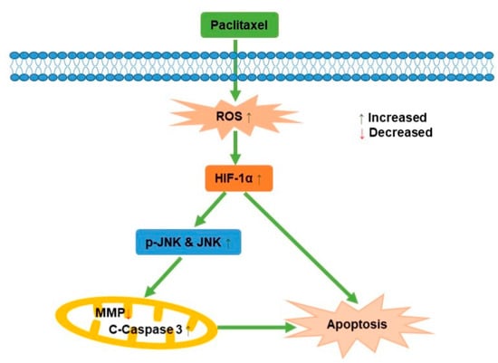 JNK, known as stress-activated protein kinase, mediated the transduction of extracellular signals into cells. Previous studies reported that ursolic acid promoted apoptosis, mainly by activating JNK to mediate Bcl-2 phosphorylation and degradation, while activating caspase-9 [41]. Apoptosis induced by green tea polyphenols was mainly regulated by FAS death receptor/caspase-8 pathway, which was activated by JNK and led to apoptosis in a Fas/FasL-dependent manner [42]. In this study, it was demonstrated that the potential mechanism behind how paclitaxel affected the PC3M cells apoptosis was via ROS-mediated HIF-1α expression, as illustrated in Figure 7, which contributes new insights for a comprehensive understanding of the antineoplastic effect of HIF-1α in PCa.