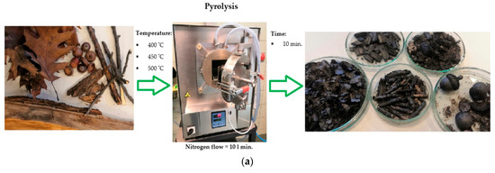 As reported by the International Biochar Initiative (IBI), biochar is a fine-grained carbonization product characterized by high organic carbon content and low susceptibility to degradation. It is obtained by pyrolysis of biomass and biodegradable waste [1,2]. Biochar has physical and chemical properties suitable for the safe and long term storage of carbon in our environment. It is produced under certain controlled conditions, which makes the carbon therein more stable and can be converted into utility products [3,4,5,6,7]. The most commonly used biomass is wood and its residues and by-products, i.e., wood chips and sawdust, agricultural residues and their by-products, e.g., quinoa, rice husks, manure, as well as waste from the paper industry, household waste and wastewater [6,7]. Until the 19th century, biomass was mainly used for the production of thermal energy in the process of direct combustion. Combustion by-products such as ashes were used to fertilize soils [8]. The growing demand for energy and increasing awareness of the need to protect the environment have led scientists to look for and exploit new alternative sources of biochar [6]. A promising source of renewable energy, in liquid form, is biofuel from the pyrolysis of microalgae. Advanced development of microbiological technology has favored biofuel production from microalgal biomass as the third generation of bioenergy. In view of compositions, microalgal carbohydrates, lipids and proteins are ideal as feedstock for bio-oil production, as well incite the potential of fossil fuels replacement by microalgal biofuel [9,10]. Popular raw materials for biochar production include rice husk, wood bark, sugar beet waste, empty fruit bunches, dairy fertilizer, pine wood, wood chips, organic waste, plant residues, human manure and poultry manure [11,12]. The use of biomass obtained from waste for the production of biochar is an effective way of converting them into a useful substance of increased value [6,7]. Among alternative sources of biomass, researchers emphasize using residual sources [13]. However, use raw biomass of residual origin can be problematic. Crude waste biomass has a non-uniform structure, a higher humidity and a much lower calorific value [14]. For these reasons, the use of raw biomass is hardly economically viable. The implementation of mechanical, thermal or organic processes can greatly improve the physical properties of the original biomass and increases its profitability [15].
