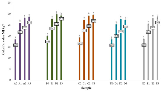 Calorific value of oak biomass and produced biochars. Differences between average values described with the same alphabet signs are statistically insignificant at the level of p ≤ 0.05 based on the Duncan test. The data were analyzed separately for each type of materials.