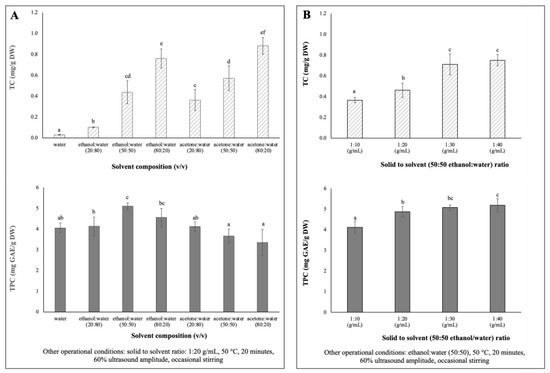 Single factor experiments of the UAE parameters’ effects on TC (mg/g DW) and TPC (mg/g DW) extracted from chayote leaves: (A) solvent composition: water, ethanol, acetone (B) solid to solvent ratio (g/mL). Results were expressed as mean ± standard deviation (n = 3). Different letters on top of bars (a–f) in the same group indicate significant differences (p < 0.05) between means according to Duncan’s multiple range test.