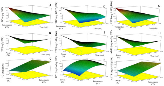 The curve analysis of response surfaces for experimental design is shown in Figure 2, which allowed the prediction of the responses TC (Y1), TPC (Y2) and ABTS (Y3) function of the effects of the time (X1), temperature (X2) and ultrasound power (X3) extraction parameters. Model equations were visualized in the form of three-dimensional surface plots, which were constructed by plotting the response on the Z-axis against any two independent variables, while maintaining other variables at their optimal levels.