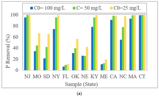 Al-WTRs showed a wide range of P removal efficiencies, as shown in Figure 2a. Al-WTR from CT removed more than 99% of P in all three adsorption experiments. Al-WTR from FL showed the lowest removal efficiency of 6.7% for 100 mg/L P solution and 11% for 25 mg/L P solution. The difference can be attributed to the varying chemical properties of the WTRs, particularly oxalate-extractable Al content. Similar observations were reported by other researchers [44,45,46]. More than half of the 13 investigated Al-WTR samples removed more than 97% of phosphorus from the 25 mg/L P solution. This is a significant result, considering that for environmental applications, 25 mg/L P is considered very high. However, such high P concentrations were tested to evaluate the upper threshold of P adsorption capacity of Al-WTRs, similar to the studies by Babatunde et al. [44] and Gysper et al. [47], who worked with 30–150 mg/L P, as well as Bal Krishna et al. [48] and Wang et al. [49], who used even higher concentrations, ranging from 100 to 600 mg/L P. As expected, with increasing initial P concentrations, removal efficiencies decreased, but the range differed from sample to sample. By increasing P concentrations, the P removal rate for some samples decreased significantly, whereas it was not considerably affected for others. For example, P removed using Al-WTR from South Dakota decreased by 67% when the initial P concentration increased from 25 to 100 mg/L in solution, whereas it was only reduced by 4% for Al-WTR from New Jersey. These Al-WTRs differed significantly in their chemical properties, particularly Alox concentrations (Figure 1).