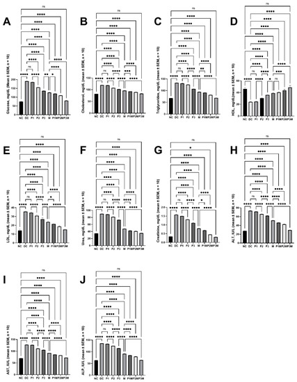 The effects of the pharmacodynamic activity of puerarin and metformin and the pharmacodynamic interaction between puerarin and metformin on serum biochemical parameters. (A) Hyperglyceamia, (B) cholesterol, (C) triglycerides, (D) HDL, (E) LDL, (F) urea, (G) creatinine, (H) ALT, (I) AST, (J) ALP. The groups are represented as follows: NC, normal control; DC, diabetic control; P1, puerarin (80 mg/kg); P2, puerarin (120 mg/kg); P3, puerarin (160 mg/kg); M, metformin (100 mg/kg); P1M, puerarin (80 mg/kg) + metformin (100 mg/kg); P2M, puerarin (120 mg/kg) + metformin (100 mg/kg); P3M, puerarin (160 mg/kg + metformin (100 mg/kg).The annotations on the pairwise comparisons are as follows: ns, not significant (p > 0.05); *, p ≤ 0.05; **, p ≤ 0.01; ***, p ≤ 0.001; ****, p ≤ 0.0001.