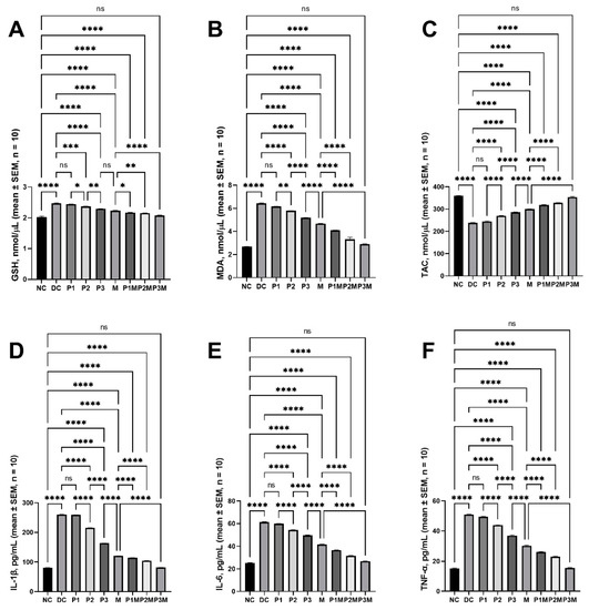The pharmacodynamic activity of puerarin and metformin and the effects of the pharmacodynamic interaction between puerarin and metformin on the oxidative stress and inflammation. (A) GSH, (B) MDA, (C) TAC, (D) IL-1β, (E) IL-6, and (F) TNF-α. The groups are represented as follows: NC, normal control; DC, diabetic control; P1, puerarin (80 mg/kg); P2, puerarin (120 mg/kg); P3, puerarin (160 mg/kg); M, metformin (100 mg/kg); P1M, puerarin (80 mg/kg) + metformin (100 mg/kg); P2M, puerarin (120 mg/kg + metformin (100 mg/kg); P3M, puerarin (160 mg/kg) + metformin (100 mg/kg). The annotations on the pairwise comparisons are as follows: ns, not significant (p > 0.05); *, p ≤ 0.05; **, p ≤ 0.01; ***, p ≤ 0.001; ****, p ≤ 0.0001.