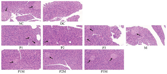 The histology of the pancreas. The black arrows show the locations of islets in the pancreas. The groups are represented as follows: NC, normal control; DC, diabetic control; P1, puerarin (80 mg/kg); P2, puerarin (120 mg/kg); P3, puerarin (160 mg/kg); M, metformin (100 mg/kg); P1M, puerarin (80 mg/kg) + metformin (100 mg/kg); P2M, puerarin (120 mg/kg) + metformin (100 mg/kg); P3M, puerarin (160 mg/kg) + metformin (100 mg/kg).
