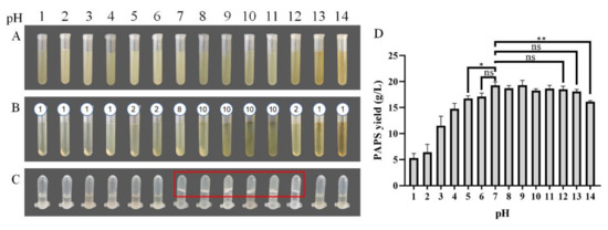 PAPS extraction process. (A) The fermentation broth was adjusted to the corresponding pH and heated. (B) The bacteria were separated by centrifugation. The number above the tubes represented the number of centrifugations required to obtain the supernatant. (C) The PAPS samples were dissolved to 10 g/L. (D) PAPS yield under different pH condition. The ns indicates no statistical significance of differences; * indicates the statistical significance of differences at p < 0.05; ** indicates the statistical significance of differences at p < 0.01.