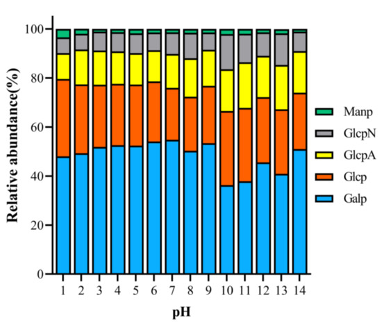 In order to investigate the differences between PAPS extracted at different pH values, we characterized the monosaccharide components. Figure 3 illustrates the differences in monosaccharide components at different pH levels. The monosaccharide components of all samples were composed of glucose, galactose, mannose, glucuronic acid, and glucosamine (Figure S3). Overall, the monosaccharide content was similar under the different pH conditions. For example, the PAPS contents of all samples were, in descending order, galactose, glucose, glucuronic acid, glucosamine, and mannose. There are some differences, though. Specifically, the percentage of galactose was lowest at pH 10 (36.29%) and highest at pH 7 (54.80%). The percentage of glucose was highest at pH 1 (31.58%), while the percentage of glucuronic acid was highest at pH 11 (18.62%). We noted that there was no correlation between differences of monosaccharide components and changes in pH. This is not the first time this phenomenon has been observed, though it is somewhat different from what might be expected. Wang et al. (2021) extracted polysaccharides from Actinidia deliciosa using different extraction methods and found that the differences in the monosaccharide fractions of the polysaccharides were significantly dependent on the extraction process [27]. A similar phenomenon was observed with the polysaccharide extracted from Symphytum officinale L. by Shang et al. [27].
