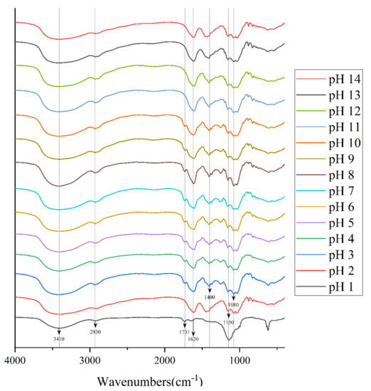 According to the study by Ahmad Usuldin et al., the FT-IR spectra of PAPS samples treated with different pH were plotted as shown in Figure 4 [28]. There were many common characteristic absorption peaks among them, which means that they had many of the same organic functional groups [29]. The strong and broad typical peaks near 3410 cm−1 represented stretching vibrations of the hydroxyl group [30]. We attribute the peak at approximately 2930 cm−1 to a C−H stretching band in a sugar methylene group [31]. The absorption peaks at approximately 1620 cm−1 may represent the asymmetric C=O stretching vibrations of the carboxyl group, indicating the presence of uronic acids, and it may also be due to the bound water [32]. In addition, the absorption at approximately 1150 cm−1 indicated a pyranose, which was consistent with the results of monosaccharide composition analysis [33]. However, there were some different characteristic absorption peaks between the polysaccharide samples. Among these, the FT-IR spectra of polysaccharides treated with pH 1 were the most divergent from those of other conditions, which may be because some organic groups reacted under the action of a strong acid. In the pH−1-treated polysaccharide, the absorption peak around 1731 cm−1 was assigned to the C=O stretching vibration, whereas at pH 2–14, this characteristic absorption peak did not appear [30]. On the contrary, at pH 2–14, a characteristic absorption peak appeared near 1400 cm−1, which we attribute to deformation stabilization of C–H [34]. In addition, pH 2–14 samples all exhibited feature-absorption peaks around 1150 cm−1 and 1080 cm−1, which represent C−O−C and C−O−H retractive vibration [35]. Compared with pH−2–14-treated PAPS, there is another interesting phenomenon; the absorption peak of pH 1 near 3410 cm−1 was significantly lower than that of other solutions, which indicates that strong acid conditions affect both inter-molecular hydrogen bonds and intra-molecular hydrogen bonds [26]. Since NMR analysis is a heavy job, we stopped at FT-IR; NMR will be analyzed in subsequent studies.