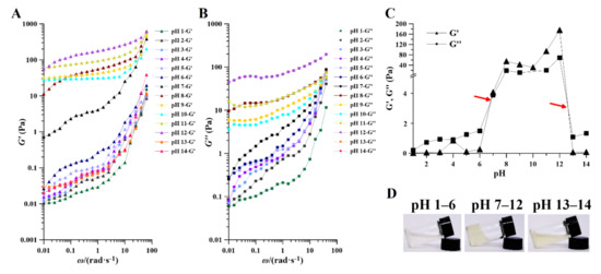 Of the rheological properties of PAPS, the properties within the linear range of storage modulus (G’) and loss modulus (G”) best reflect the aggregation structure properties of substances. The G’ means that the stress energy can be recovered after being temporarily stored in the test, while the G” means that the irreversible loss is converted into heat. As can be seen from Figure 6, within the range of the oscillation frequency tested, the G’ and the G” increased with the increase of oscillation frequency, due to the fact that with increasing frequency, the chain segments do not have time to fully extend their orientation. The G’ values of the samples treated at pH 1–7 increased gradually with increasing pH. Samples treated at pH 8–12 always had a higher modulus of G’, and there was no significant relationship between them. The G’ of the PAPS treated at pH 13–14 decreased to a lower level. Similarly, the G” of PAPS in response to pH was in perfect agreement with the G’ (Figure 6B). In addition, we found that the G” at pH 1–6 and pH 13–14 was always higher than the G’ over the range of scanning frequencies, thus creating liquid-like behavior, while the G’ at pH 7–12 was always higher than the G”, thus leading to solid-like behavior (Figure S4) [40,46]. This feature was also visualized in Figure 6C, where there were two intersections of G” and G’ between pH 6–7 and pH 13–14, causing the samples to show different characteristics at different pH levels (Figure 6D).