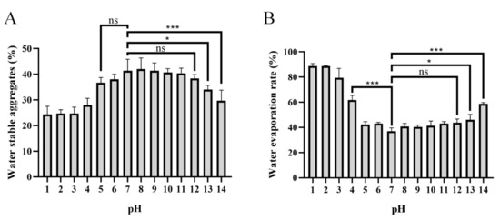 Effects of pH−1–14-treated PAPS on water-stable soil macro-aggregates (A) and water evaporation (B). The ns indicates no statistical significance of differences; * indicates the statistical significance of differences at p < 0.05; *** indicates the statistical significance of differences at p < 0.001.