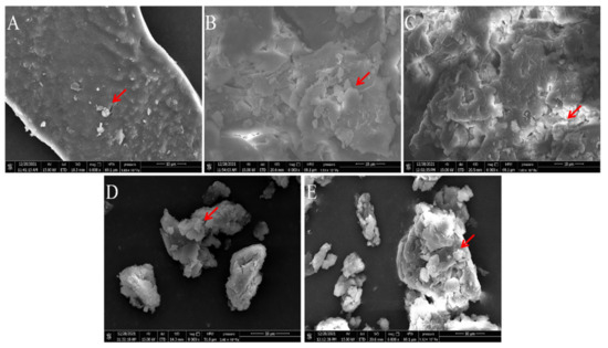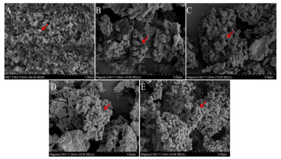 Comparison of molecular morphology of P. alhagi treated by different methods ((A) under pH−2 conditions; (B) under pH−7 conditions; (C) under pH−9 conditions; (D) under pH−12 conditions; (E) under pH−13 conditions). Magnification is indicated in the micrographs.