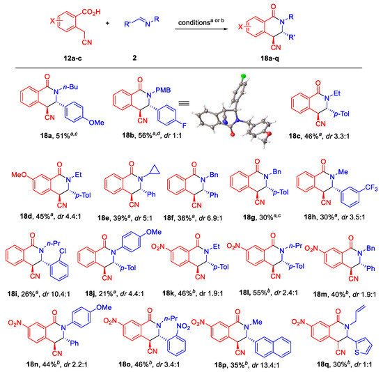 With the substrates 12a–c at hand, we proceeded to explore their modified CCR with various imines 2 using either CDI (1,1’-carbonyldiimidazole) or acetic anhydride (Ac2O) [11] as the carboxylic group activator (Scheme 2). To our delight, the reaction delivered the expected 4-cyanotetrahydroisoquinolones 18a–q in moderate yields and displayed either no diastereoselectivity (cf. 18b or 18q) or gave exclusively one diastereomer (cf. 18a or 18g). The relative trans-stereochemistry was assigned to the major diastereomer obtained in the majority of cases by correlation of their spectral properties (specifically, the 3J coupling constants between the methine protons) with those of the trans-18b whose stereochemistry was unequivocally confirmed by the single-crystal X-ray analysis (CCDC2192610). This isomer of 18b (with X-ray data) revealed the signal of H-3 methine atom as doublet with J = 2.6 Hz (for details see ESI, Table S3), while the other (cis) isomer displayed the coupling constant of J = 5.9 Hz. For all other products 18 the corresponding coupling constants were found to be in the range 1.7–2.7 Hz for major isomers and 5.6–6.3 Hz for the minor. The reactivity of unsubstituted (12a) or methoxy-substituted (12c) substrates was markedly lower compared to their nitro-substituted (12b) counterpart. While in the former case, prolonged heating at 130 ℃ with CDI as the activating agent was needed, in the latter case, only two hours at 60 ℃ were sufficient to complete the reaction with Ac2O as the carboxylic acid activator.