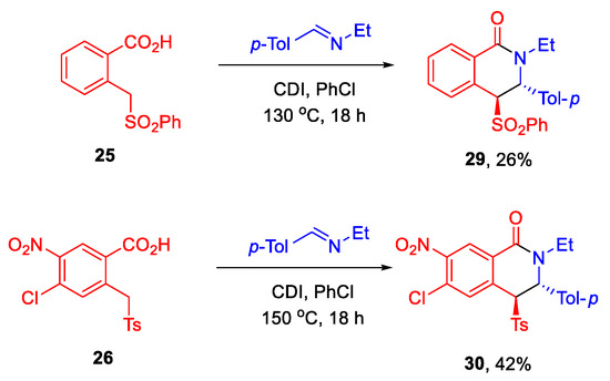 Unfortunately, all attempts to react azidoalkyl (27) and nitroalkyl (28) substrates (Scheme 6) with imines in the Castagnoli–Cushman fashion failed, thereby signifying clear limitations of this variant of CCR at the level of electron-withdrawing groups in the α-position of o-methyl benzoic acid substrates.