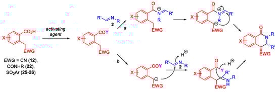 Mechanistically, the new variant of the CCR of substrates 12, 22, 25 and 26 (which successfully delivered tetrahydroisoquinolone adducts) is thought to involve the initial activation of the carboxylic function by either CDI or acetic anhydride. The activated substrate can then interact with the imine via two possible pathways [29]: (a) via an N-acylation of the imine component followed by the deprotonation of the α-C-H position and intramolecular Mannich-type cyclization; or (b) via the deprotonation of the α-C-H position first intermolecular Mannich-type reaction with the imine component, followed by intramolecular N-acylation of the resulting secondary amine intermediate by the activated carboxylic acid function (Scheme 8).