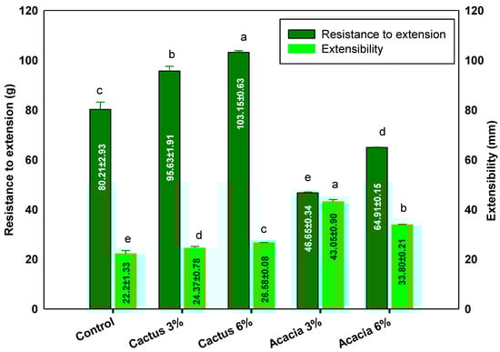 Dough extensibility properties of flour gum blends. Values followed by different letters in same color bars are significantly different at p < 0.05.
