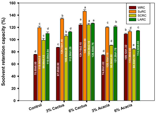 The solvent retention capacity of the wheat flour and blends with acacia and cactus gums is presented in Figure 2. The SRC provides a fruitful profile of the flour blends’ qualities and possible functionality in order to estimate their baking performance. The SRC quantifies the extent of the swelling of the polymer networks of flour or blends by retaining the given solvent and relating it with the functionality related to the specific fractions found in the blends. Thus, based on the specific functionality, the flour or blends could be opted for in a particular baking application. Here, in this study, four types of solvent retentions were estimated, namely water (WRC), sodium carbonate (SCRC), sucrose (SuRC), and lactic acid (LARC). WRC is related to the total functional components of the flour blends, such as starch, glutenin, gliadins, arabinoxylans, etc. [38,39].
