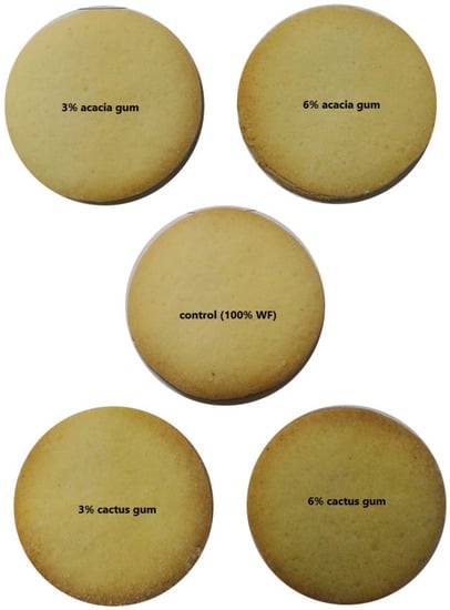 The color components (L* (lightness), a* (greenness), b* (yellowness)) of the control wheat flour cookies and the cookies with the wheat flour and gum blend were estimated and are presented in Table 4. The highest L* value was noticed for the control cookies and for the cookies with 3% acacia gum. On the other hand, the lowest L* value (76.71) was observed for the cookies manufactured from the flour blended with 6% cactus gum. However, compared to the 3% gum, the addition of 6% gum to the wheat flour cookies significantly lowered the L* value. These lower L* values are justified by the higher a* values for the cookies with higher concentrations of both of the gums. The increased a* and reduced L* might be due to the formation of color pigments as a result of non-enzymatic browning during baking. On the a* scale, the lowest value was noticed for the cookies prepared without any gum. In terms of b*, the control sample with no added gums showed the highest value of 28.06, indicating the highest yellowish tinge, whereas the lowest were found for the cookies containing a higher percentage (6%) of both of the gums. Thus, the darkest sample was the one prepared with 6% cactus gum, as is also shown in Figure 3. Mohamed, Alamri, Hussain, Ibraheem, Qasem, Shamlan, and Ababtain [6] reported the reduction in L* for the cookies with the added cordia and ziziphus gums, where the darkest sample was the one with the addition of 2% ziziphus gum.