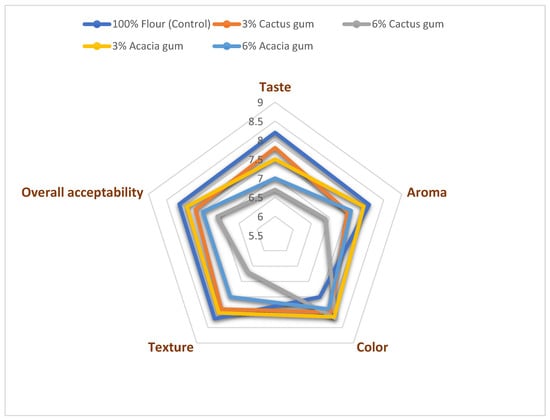 The hedonic average rating of the sensory characteristics of the cookies, such as color, taste, aroma, and texture, and their impact on their overall acceptability is presented in Figure 4. The color is the first and foremost appealing factor of the bakery products, which is attributed to the spectral distribution of light emerging from the surface of the cookies. In bakery products, the development of color is mainly attributed to non-enzymatic browning, such as that via the Maillard reaction. The cookies prepared with wheat flour blended with 6% cactus gum were ranked the best by the panelists. However, a similar ranking was obtained by the cookies manufactured using the blend with 3% acacia gum. Among all the samples, the cookies baked from wheat flour received the minimum likelihood, with a score of 6.5. The better preference for the cookies with the gum could be attributed to the presence of some protein and reducing sugar fractions in the gums and to the better water-holding capacity of the gums. In addition, once heat was applied the formation of the Maillard products would be higher, which might have contributed to the brown color formation in the brown color, which was appealing to the panelists. The lowest L* value of the cookies with 6% cactus gum also supported this trend of color development.