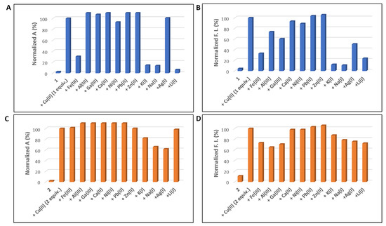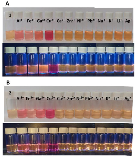 | This work for 2 | 0.16 (UV-Vis), 0.18 (Fluorescence) | Cu2+ (Li+, CN−) |
